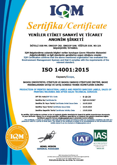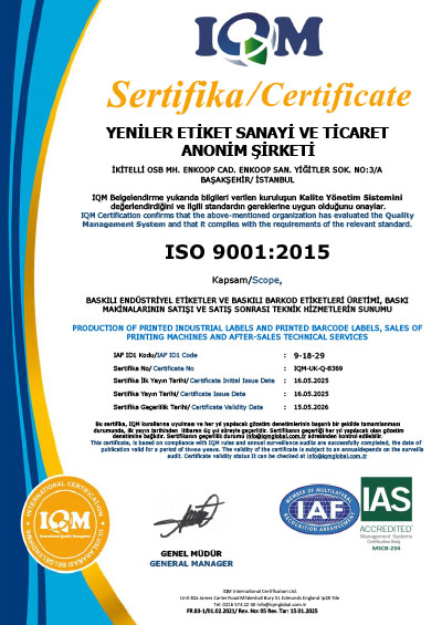 ISO 9001:2015 Quality Management System: This standard enables a company to establish and maintain a quality management system to improve customer satisfaction. This system aims at improving product and service quality by focusing on continuous improvement and effective management of processes. Yeniler Etiket continuously improves its quality standards in accordance with this certificate.