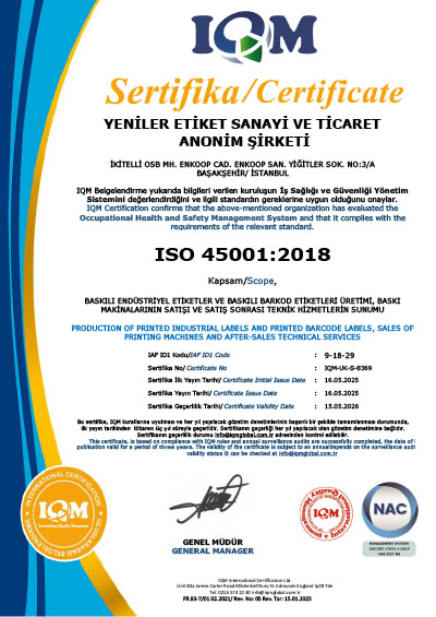 ISO 45001:2018 Occupational Health and Safety Management System: This standard provides a framework for managing occupational health and safety risks. It aims to protect the health and safety of employees and aims to prevent job accidents and occupational diseases. Yeniler Etiket gives top priority to the safety of its employees and continues to take effective measures on occupational health and safety.